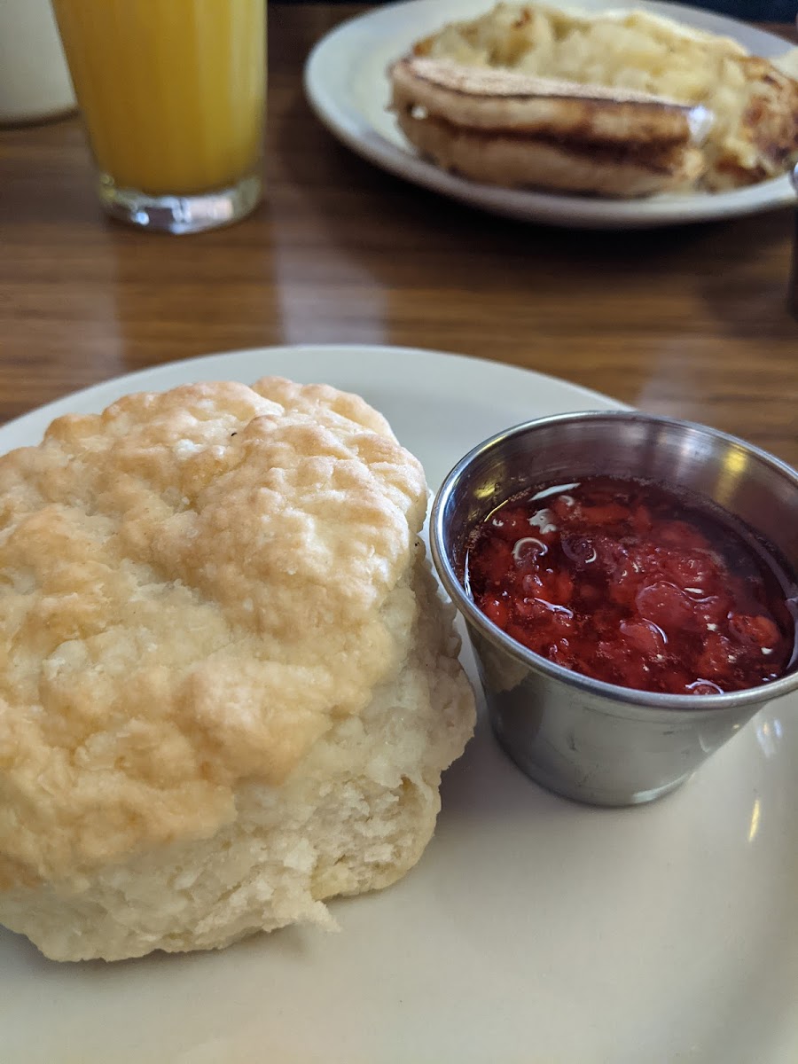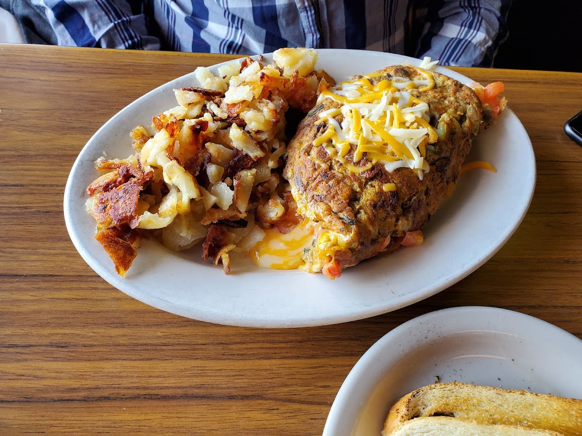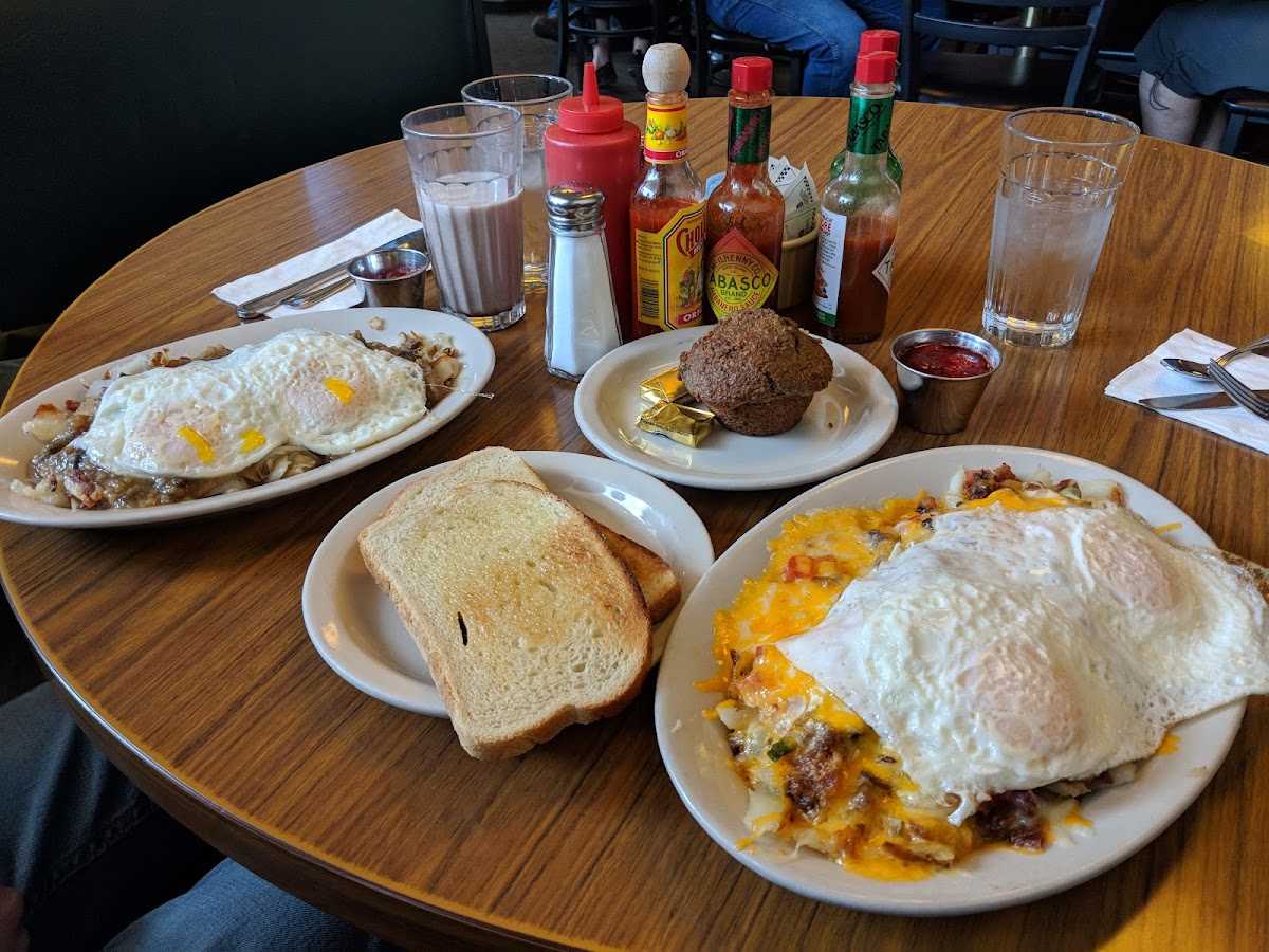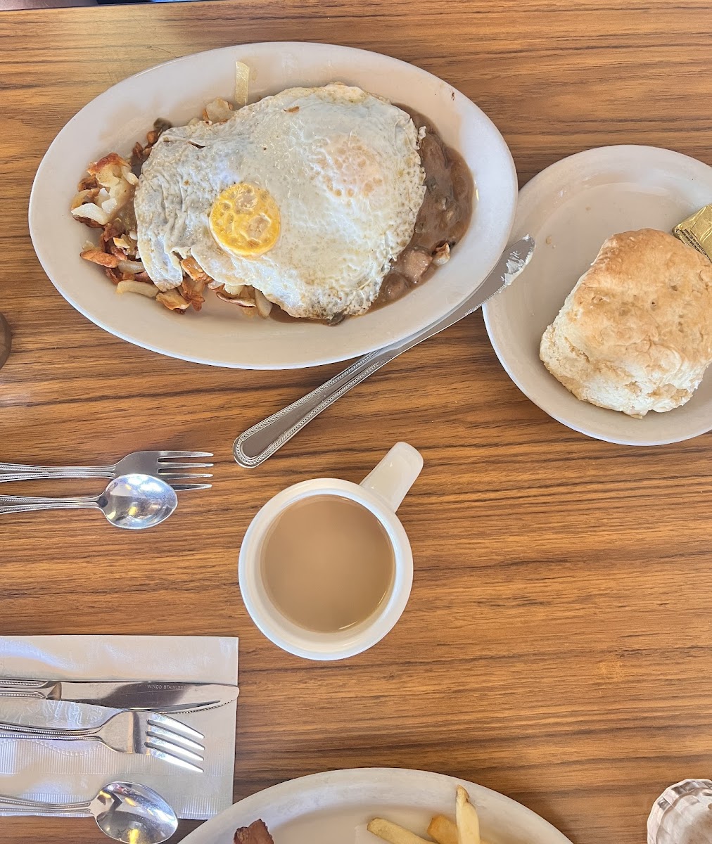 I went to the Buffalo Café with a few family members and we had a great time. We arrived on a weekday just around 11 AM and the place was already packed. We got the only booth that was open, thankfully. The atmosphere seemed very upbeat with people just having a good time chowing down. My wife got the Buffalo Chip which consists of fried potatoes, bacon, cheese, green chilies, tomatoes, green onions, and a couple eggs on top, fried of course. It was amazing. There’s plenty of cheese all throughout the dish. I had the chicken fried steak and eggs. I did not realize that it came with a biscuit or fried potatoes so when they told me that it came with a biscuit, I asked if they could put gravy on it. I unknowingly just ordered another entrée seemed, because when they came out with my chicken fried steak and eggs, they also came out with another platter that had just the biscuit and gravy on it. It was all very good. The chicken fried steak was authentic as it gets, definitely not frozen. If it is, I would be very surprised. The gravy was delicious, but could be a little warmer. My wife had a biscuit with homemade raspberry jam, which was absolutely delicious. My little man enjoyed a meal of fried potatoes, scrambled eggs with ham, and sourdough toast. He had a great time. Our waitress was excellent, very nice and attentive for the place being so full. We really enjoyed the Buffalo Café. I recommend the Buffalo Café.